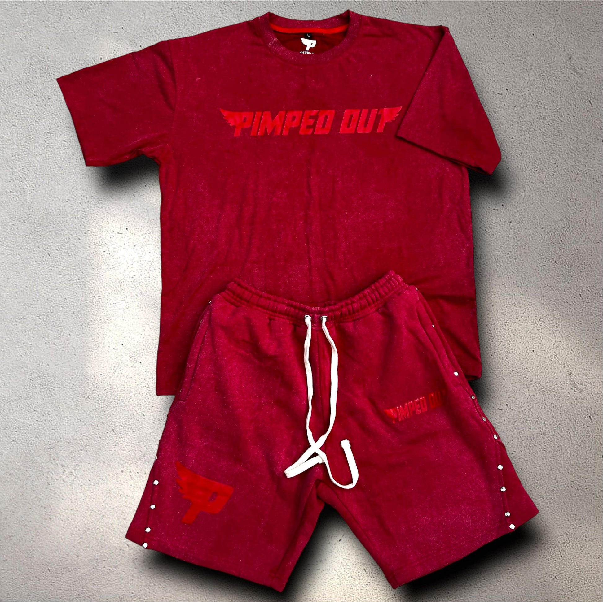 . Available in four vibrant colors, it includes riveted studs on the sides for an edgy touch, while our signature winged logo adds a distinctive flair to both the t-shirt and shorts. Perfect for lounging or a day out, this set combines fashion and functionality effortlessly!.